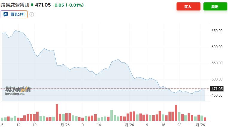 路威酩轩集团近三个月股价跌去了26.6%(数据&图源:Investing)