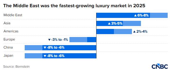 中东地区是2025年增长最快的奢侈品市场(数据:Bernstein;图源:CNBC)