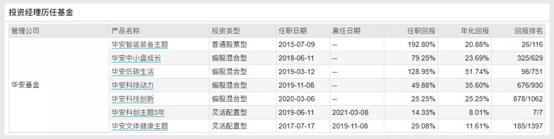 比如李欣,目前管理5只产品,管理规模65.07亿元,代表产品华安智能装备主题管理时间接近6年,任期回报192%,年化20%,回报排名26/116。